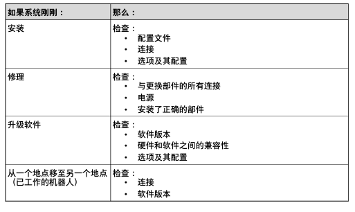 在发生故障时,机器人是否是最近 全新安装的?最近是否修理过? 下表是有关在特定情况下所要检查内容的提示信息
